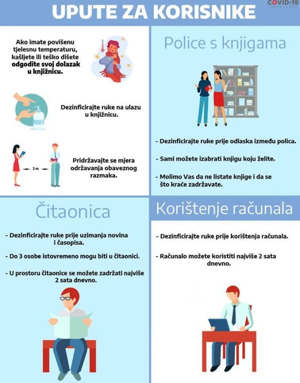 Korisnici će tako moći ulaziti među police u knjižnici i samostalno tražiti građu, koristiti računala i Čitaonicu. Molimo korisnike da obrate pažnju na pisane upute u knjižnici i upute knjižničarke vezane uz korištenje računala i Čitaonice.